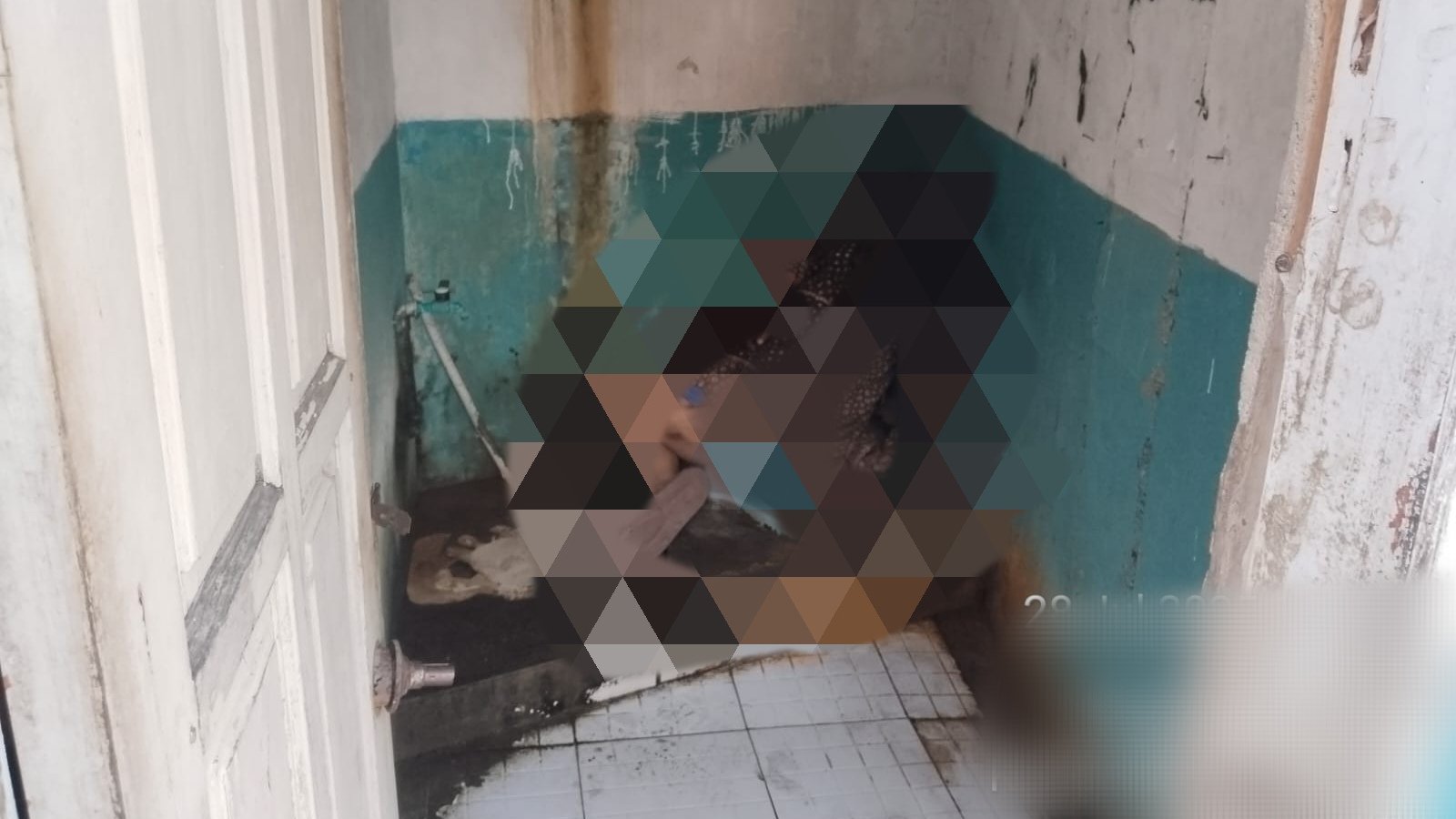 Kemudian Sekira pukul 13:30 wib, ada saksi curiga keberadaan korban terlihat kaki di dalam kamar mandi dalam keadaan terkunci dari dalam.