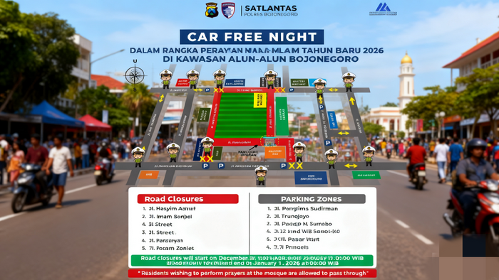 Bojonegoro, UpWarta.com – Satlantas Polres Bojonegoro akan menerapkan rekayasa lalulintas ‘car free neight’ di kawasan menuju alun – alun pada malam pergantian tahun 2026.