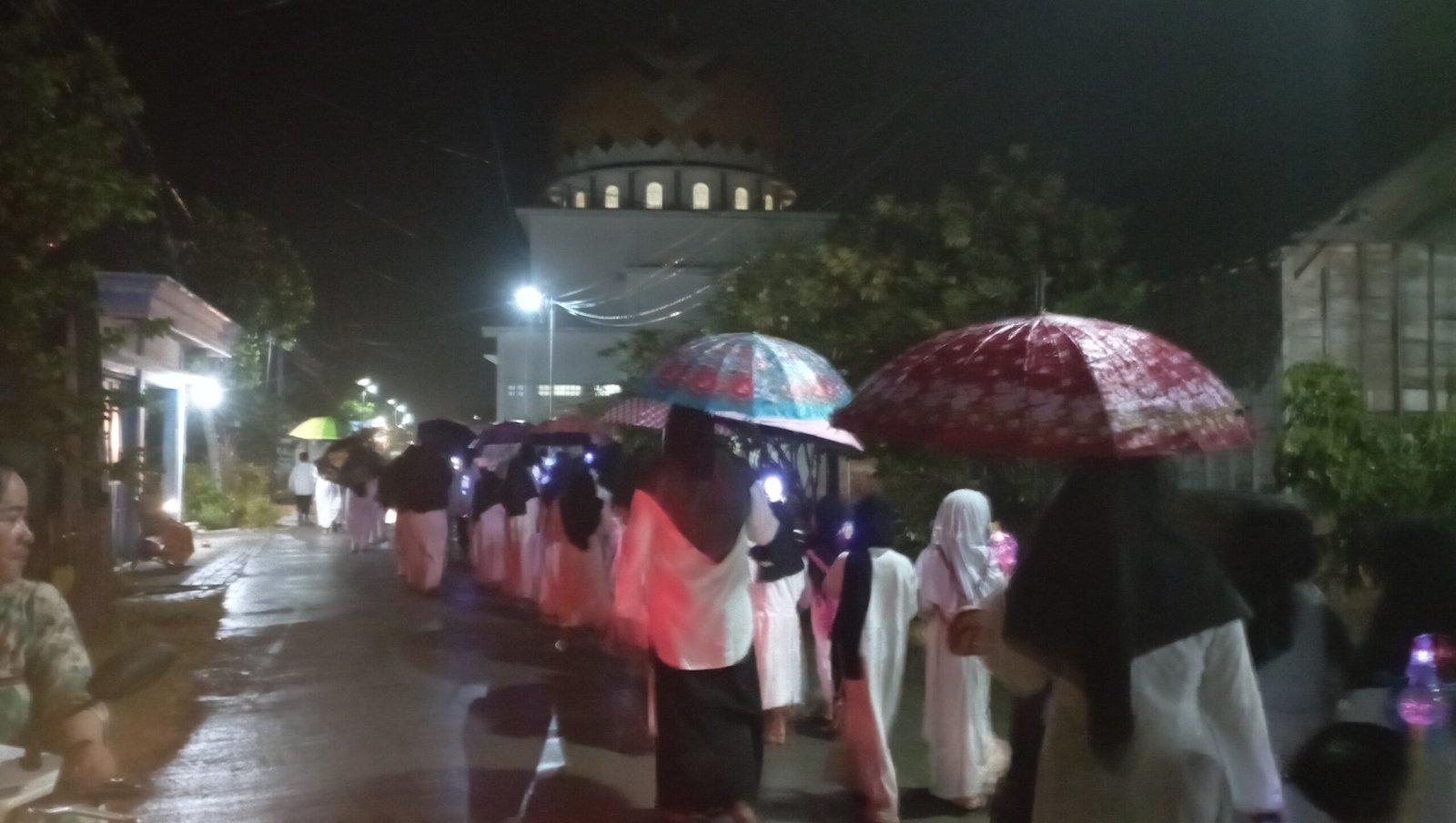 Terlihat, di antara cahaya lampu di bawa di tangan serta lantunan takbir yang menggema, anak-anak degan di dampingi wali santri, berjalan menyusuri jalan desa dengan penuh semangat.