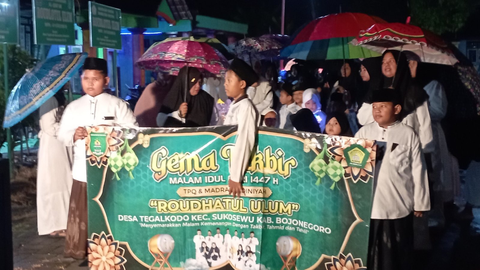 Di Desa Tegalkodo, Kecamatan Sukosewu, Kabupaten Bojonegoro, Jumat (20/3/2026), setelah Sholat Isya’, meski diguyur gerimis kecil, suasana jalan poros desa di malam takbiran terasa hangat dan penuh makna.